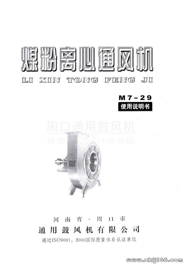 M7-29型煤粉離心通風機是按熱電站鍋爐煤粉燃燒系統所需之性能設計的,用于向鍋爐吹送煤粉,煤粉不能直接經過葉輪,否則葉輪極易磨損。蝸殼內部襯有護板,以便磨損后更換。軸承箱內存有潤滑油,供軸承散熱,并裝有冷卻水管,以冷卻潤滑油。