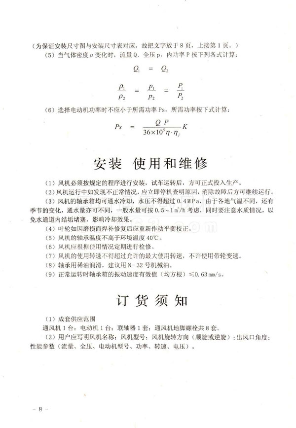 五、訂貨須知⑴ 成套供應范圍:通風機1臺;電動機1臺;聯軸器1套;通風機地腳螺栓8套。